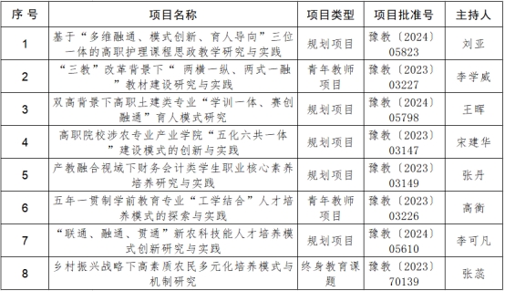 近日,河南省教育厅发布了《关于公布2024年河南省职业教育教学改革研究与实践项目和终身教育课题结项项目的通知》(教办职成〔2025〕224号),必赢官网8个项目获批结项。其中,职业教育教改项目7项、终身教育课题1项。